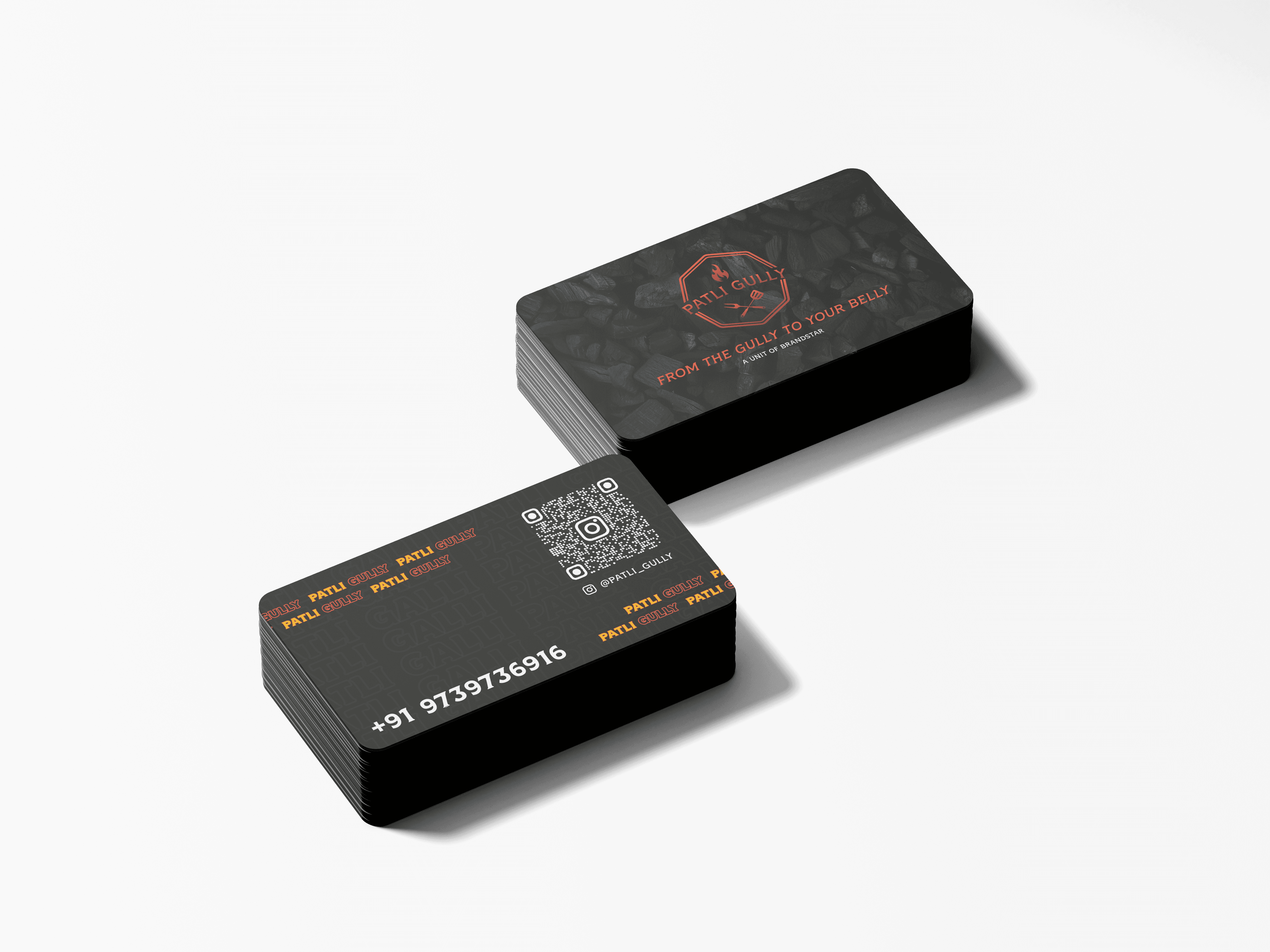 The back has a large QR code to Instagram, phone number at scale, and the @PATLI_GULLY handle. No clutter. You know exactly what to do next.